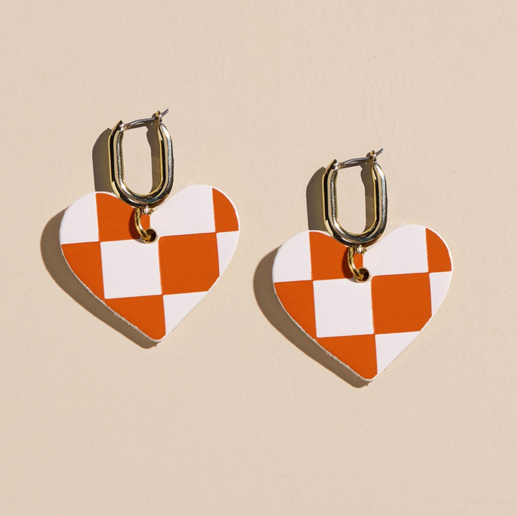 Add a playful mini statement to your game day wardrobe or everyday style with the Orange & White Checkmate Quinn Earrings. Designed for fans who love bold color in a compact, easy-to-wear silhouette, these earrings feature our signature lightweight leather heart in a vibrant orange and white checkered pattern. The heart charm hangs from a small, sleek hoop, creating a charming blend of fun, spirit and modern simplicity that instantly brightens any outfit.