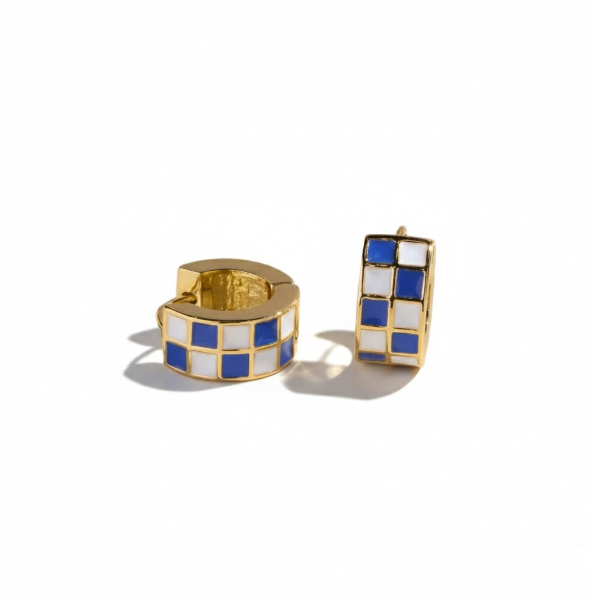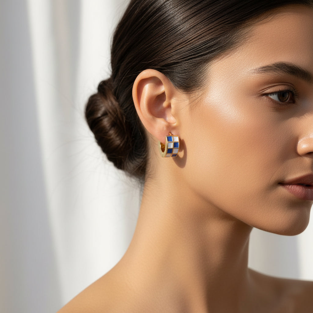ntroducing the Huggies Blue & White Checkered Enamel Earrings, a polished statement piece where bold design meets everyday comfort. These sleek huggie-style earrings feature a striking blue and white checkered enamel pattern that adds a fresh, modern edge to your accessory collection. Designed to sit close to the ear, they create a clean, refined silhouette that feels effortless yet eye-catching.