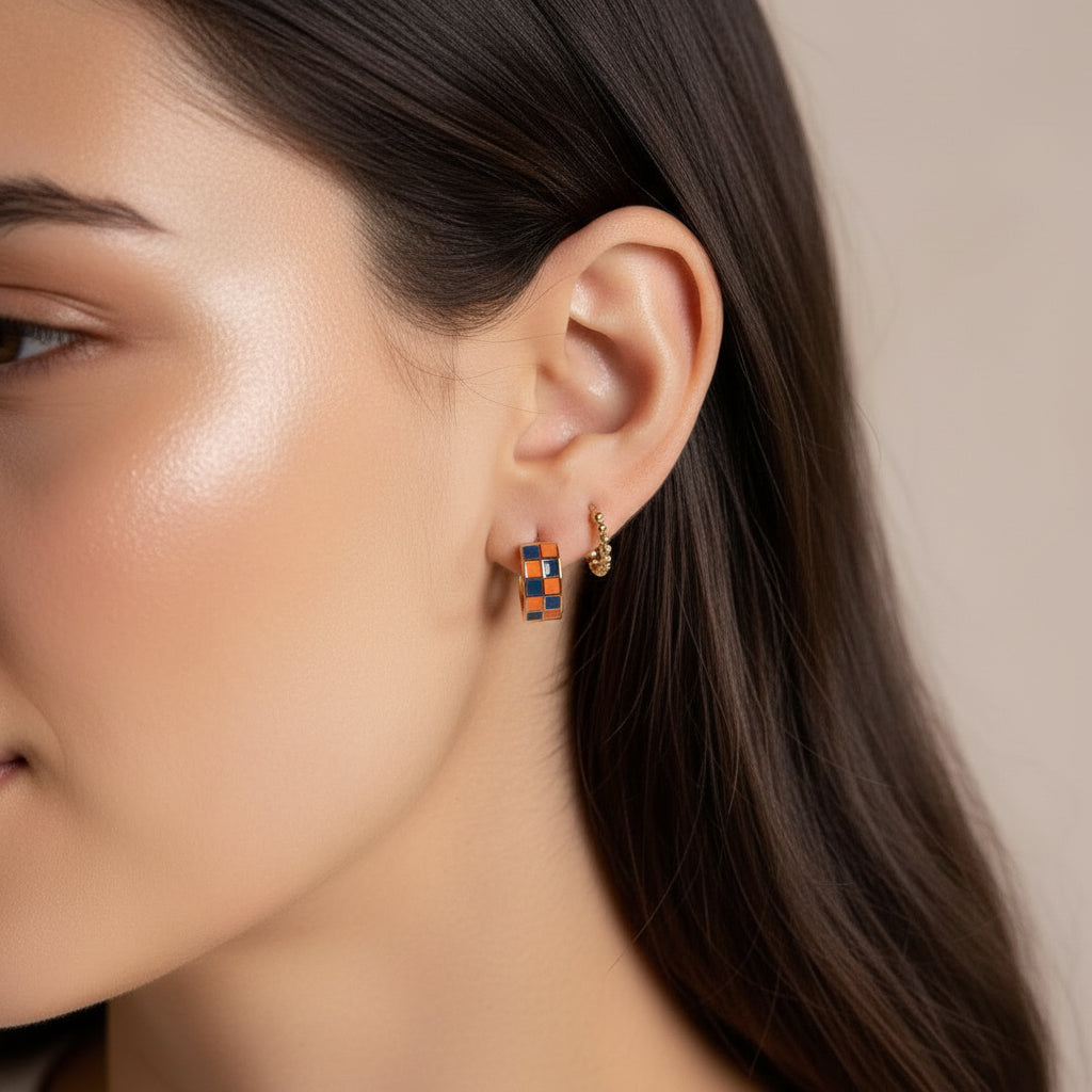 Discover the charm of the Blue & Orange Checkered Huggies Earrings, a bold yet wearable accessory designed to elevate your everyday style. These eye-catching huggies feature a vibrant blue and orange checkered enamel pattern that brings a playful pop of color while maintaining a clean, modern silhouette. Designed to sit snugly against the ear, they offer a polished look that feels effortless and refined.