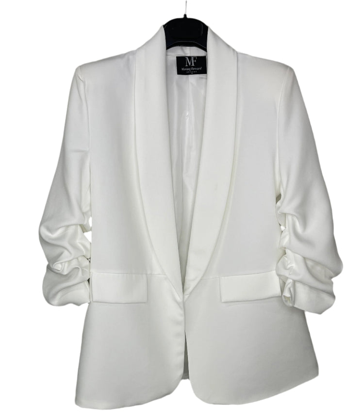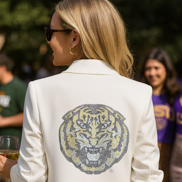 Make a bold and polished statement in this white LSU rhinestone tiger blazer, perfect for elevated game day style. Featuring a fierce crystal-embellished tiger logo on the back, this officially licensed blazer adds luxe sparkle to your team spirit. The structured silhouette is softened with feminine ruched sleeves and finished with a silky sheen for a couture-inspired touch. Whether you’re cheering at Tiger Stadium or heading to a campus event, this standout piece pairs effortlessly with shorts, jeans, or skirts for a head-turning LSU look.