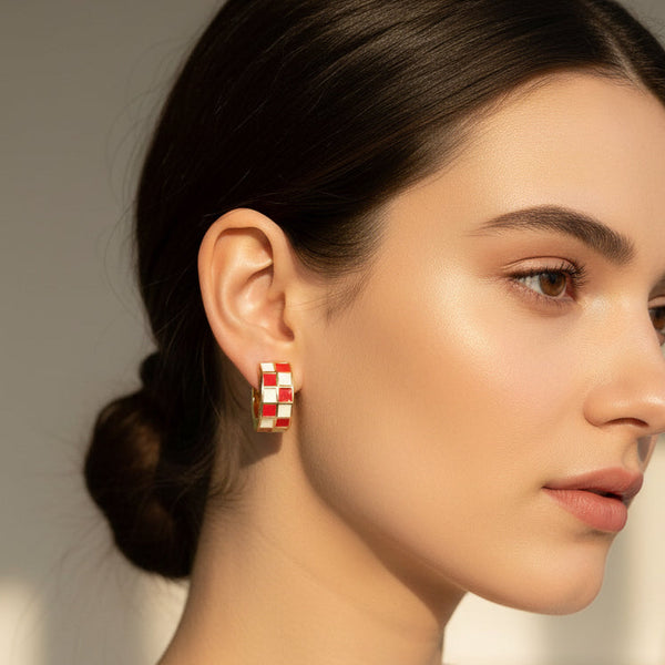 Add a playful pop of style to your jewelry collection with the Red and White Checkered Huggies, a vibrant accessory designed to stand out. Featuring a bold checkered pattern, these huggies bring a fun mix of color and personality to any look while keeping a clean, modern silhouette. Their compact design hugs the earlobe comfortably, making them perfect for everyday wear or adding flair to a special occasion outfit.