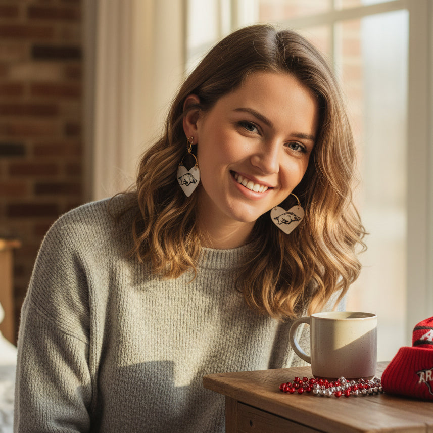 Customize your pair with 14k gold-filled or rhodium-plated sterling silver ear wires, both hypoallergenic options designed for irritation-free, all-day comfort. From early-morning tailgates to post-game celebrations, these earrings stay lightweight, stylish and comfortable, making them a dependable go-to for any Razorbacks event or everyday wear.
