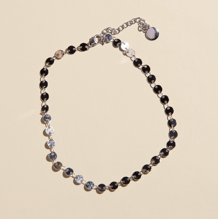 Crafted with advanced PVD (Physical Vapor Deposition) plating, the anklet features a bonded metal layer that delivers superior resistance to moisture, tarnishing, and everyday wear. This innovative process enhances durability while maintaining a brilliant silver shine, ensuring the anklet looks polished wear after wear. The delicate sequin-inspired chain catches the light with subtle movement, adding a soft, elegant shimmer that elevates your look without feeling overstated.