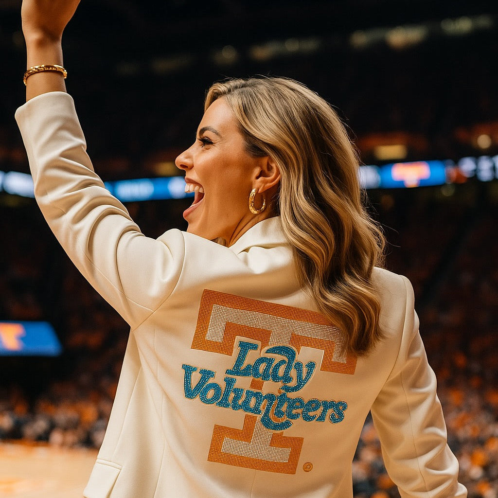 Elevate your game day style with this Licensed Game Day Blazer featuring a ruched white design and sparkling rhinestone accents. Show your Tennessee Vols Lady Volunteers pride with a sophisticated look that combines team spirit and refined fashion. Perfect for fans seeking a polished yet spirited outfit for any event.